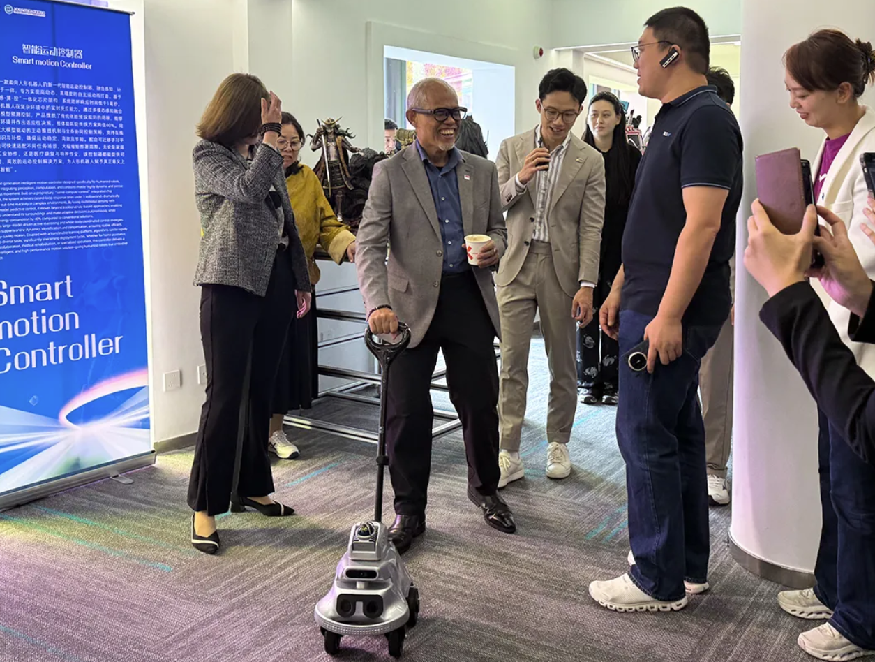 同日下午,新加坡国会议员、社会及家庭发展部长马善高一行也莅临参观交流,现场观摩前沿智能装备成果并亲身体验多款智能装备。其间,马善高部长重点驻足并体验了AI LOOK盲人助理机器人的自主导航、智能语音交互等功能;尤其在体验AI LOOK障碍物精准识别、实时语音提示与自主绕障功能后,他对产品在解决视障群体独立出行难题上的技术优越性与使用便捷性给予高度肯定。
